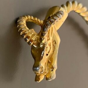 Gorgeous goat-head cuff bracelet, featuring twin sculpted goat heads with curled horns and fierce detail. The twisted gold-tone metal band gives a bold, mythic presence, perfect for layering or standing alone.