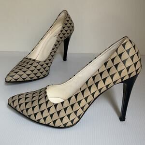 Stand out in style with these unique Goby heels featuring a bold black and beige geometric pattern. Pointed toe and sleek stiletto heel make them perfect for formal occasions, nights out, or statement office looks. Made in Turkey. Women’s size 40 (fits like US 9.5). Light wear on interior and slight signs of use—see photos.