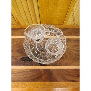 This elegant vintage crystal set includes a serving bowl, creamer, and sugar dish, showcasing intricate etched patterns. Ideal for enhancing table settings or as a collectible decor piece. Timeless craftsmanship by Godinger.