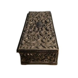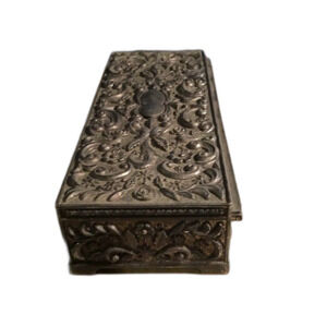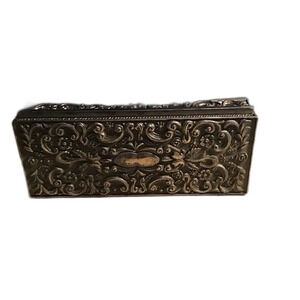 Discover this exquisite vintage Godinger silver-plated jewelry box, a true blend of elegance and functionality. Featuring a stunning floral and swirl repoussé design on a rectangular, footed frame, it adds a touch of classic charm to any vanity or dresser. The hinged lid opens to reveal a plush, protective velvet-lined interior, perfect for safeguarding your cherished rings, necklaces, and other precious trinkets. Marked Godinger, this piece reflects the brand's renowned craftsmanship and timeless style, making it a wonderful collector's item or a thoughtful gift. In very good vintage condition with a beautiful aged patina that enhances its antique appeal. Ready to beautifully store your treasures or become a striking decorative accent. Dimensions: Approx. 9"L x 4"W x 2"H.