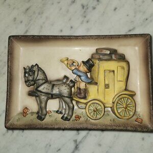Charming vintage Hummel wall plaque by Goebel, mold #140, titled The Mail is Coming (also known as Horse & Carriage). This raised-relief design shows a stagecoach scene with horse, yellow coach, and driver blowing a horn.