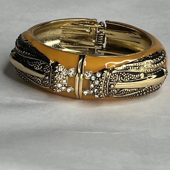 This bracelet showcases a bold design with intricate detailing and rhinestones, perfect for adding sophistication and charm to your wardrobe.