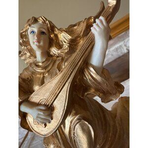 Vintage Gold Angel Figurine Playing Lute – Resin Holiday Decor, Musical Angel
