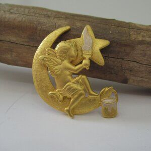 Vintage Gold Angel On Moon Painting Star Pin Brooch Signed J.J. Jonette