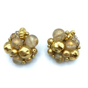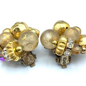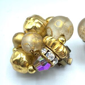 Vintage Gold Bead and Aurora Borealis Crystal Cluster Clip on Earrings