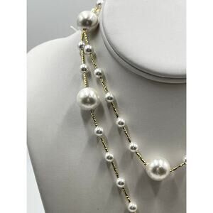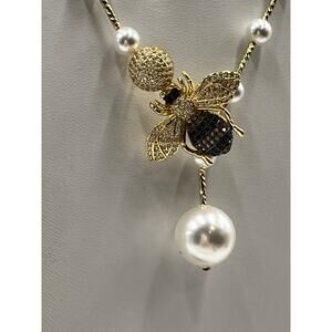 Stunning vintage-inspired long pearl necklace featuring a removable ornate pave rhinestone gold-tone bee enhancer centerpiece. The bee is also the clasp and can be placed anywhere on the necklace. This versatile piece combines lustrous white pearls with delicate gold chain segments, offering multiple styling options. This is a high quality piece.