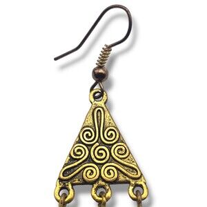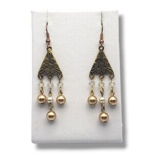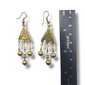 Vintage Gold Brass Tone Dangle Drop Chandelier Faux Pearl Hook Earrings