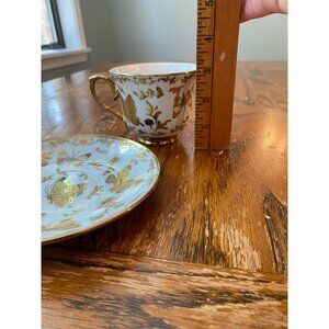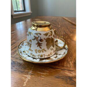 This vintage tea cup and saucer set showcases intricate gold butterfly accents on fine bone china, offering timeless elegance for your tea rituals.