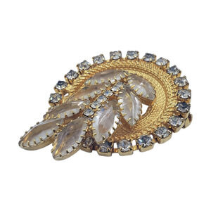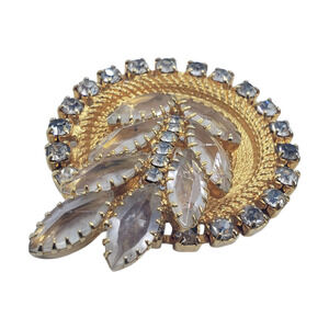 Stones: Clear rhinestones around the perimeter and clear navette stones with leaf-like etching; prong-set chatons down the leaf stem