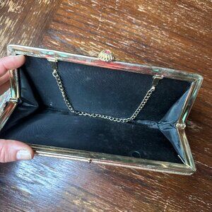 Minor surface creases and wear on the gold finish. Chain length measures approximately 8 inches, clutch dimensions approximately 8 inches x 4 inches.