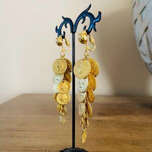 Lightweight statement-length gold-tone coin dangle earrings featuring layered Roman-style medallions and comfortable clip-on backs. Beautiful movement and shine — perfect for evening wear, festival outfits, or bold accessorizing.