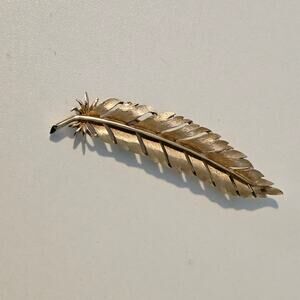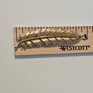 Vintage Crown Trifari gold feather brooch pin. Thin, long bird feather plume almost 3 inches long and about 1/2 inch wide (see measurements in photos). Signed and stamped Trifari with the crown.