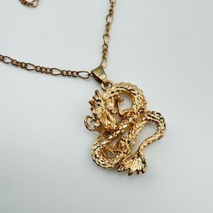 This stunning vintage gold dragon pendant necklace is perfect for fans of fantasy, astrology, and cosplay. The intricate details of the dragon, combined with the timeless gold finish, make it a truly unique piece. Whether you're a collector of dragon-themed jewelry or simply looking for a statement piece, this necklace is sure to impress.