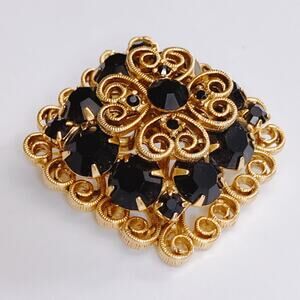 Vintage Gold Filigree Brooch Black Glass Rhinestones Scrollwork Tiered Layered