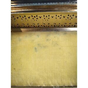 This vintage gold filigree casket jewelry box has an etched starburst design on the hinged glass lid and a flying cherub playing his horn on the center edge. A beautiful Hollywood Regency piece!
