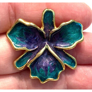 Vintage Goldtone Flower Brooch - classic 1980’s naturalist floral shape with wonderful dimension covered in a blended swirl of green & blue/purple enamel. No hallmarks - nice quality fashion jewelry - shapely and eye-catching in a size that allows multiple options to wear. Gently worn - no flaws - so pretty!