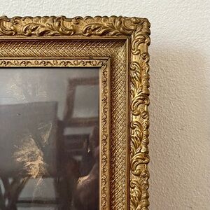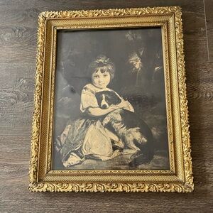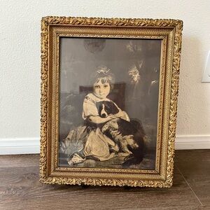 Charming art print featuring a child with a dog. Set in an ornate gold frame. Size is 16/20 inches