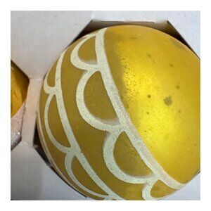 Elevate your holiday decor with these exquisite vintage glass ornaments. Crafted with meticulous attention to detail, each sphere showcases a unique golden hue and intricate white pattern, creating a sophisticated and timeless aesthetic for your Christmas tree.