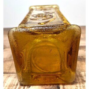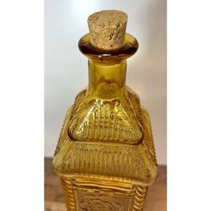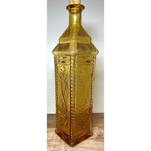 This amber glass decanter features intricate floral embossing and a cork stopper, offering an elegant decorative addition to your space or bar area.