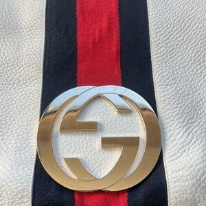 Chic 70’s Vintage Gucci shoulder bag in cream leather. Features bold red and blue stripe. Iconic gold logo accent. Gorgeous gold logo hardware. This bag is in good condition. Very light signs of wear on front hardware. It’s a real banger. No one will have this. Unique