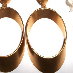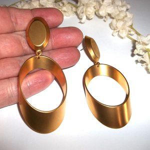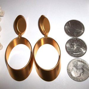 You will love wearing this vintage costume jewelry hoop earrings set. They are a brushed brassy gold tone color. They have post stud backs for her pierced ears. Measure 3 inches tall and 1 1/8 inch wide. Each single earring weighs 9.1 grams. Heavily weighted set! The perfect eye-catching piece to complete your look. Very versatile set. Could be worn fancy dressing up or dress down business comfort casual. These are timeless and classic. You can never have enough hoops. Buy them now before someone else does!