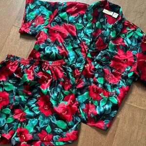 Floral print button down shirt with a monogrammed “VS” and cutie little shorts