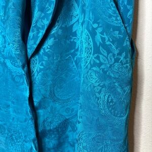 I adore this vintage sleep set! I bought it for myself, but it's a little too tight for me in the bust (I do believe it runs true to size, I was just hopeful that I could make it work). It's a teal color with a design on the fabric. Loose fitting matching shorts also in size small. To top has a notched collar and buttoned front. In very good used condition. Fantastic piece from I believe the early to mid '90s.