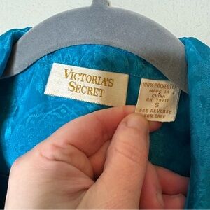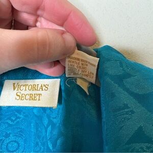 tags: Vintage Victoria's Secret, Gold Label collection, teal satin sleepwear, button-down pajama set, sleeveless top, matching lounge set, 90s lingerie, Y2K fashion, retro sleepwear, silky nightwear, Victoria's Secret Medium, classic pajama set, vintage loungewear, teal satin ensemble, feminine sleep set, vintage-inspired sleepwear, soft satin pajamas, elegant nightwear, collectible Victoria's Secret, timeless sleep set