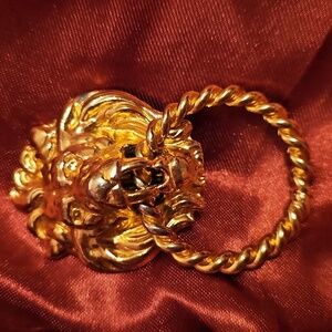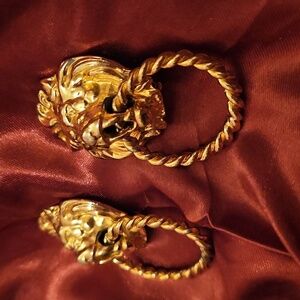 These vintage, clip on gold earrings showcase a beautifully detailed lion's head at the top. Below, a braided ring adds a unique texture, enhancing the overall design. The warm golden color makes these earrings a standout accessory.