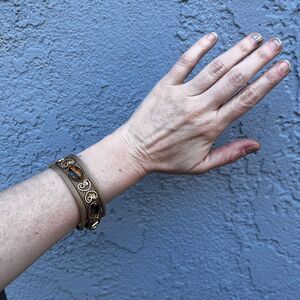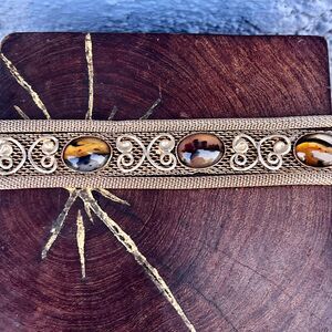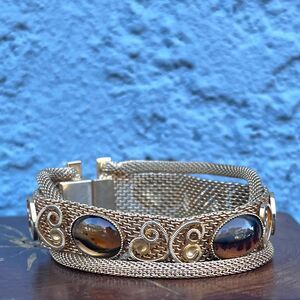 Vintage dendritic agate bracelet. Gold mesh bracelet with unique cabochons. Slide lock clasp. No makers mark.