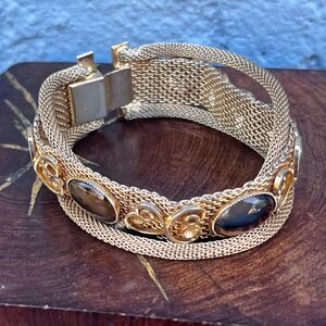 Vintage Gold Mesh Bracelet with Dendritic Agate Retro Costume Jewelry