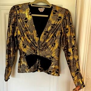 80s glam, disco, cocktail blouse, vintage party top, metallic brocade, holiday blouse, New Year’s Eve top, gothic glam, statement blouse, runway style, power dressing, vintage gold top.