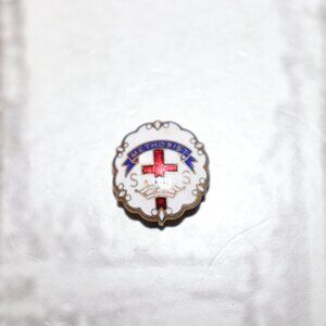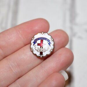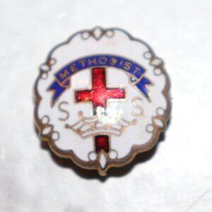 🔷 Blue enamel banner reads “METHODIST” above red cross ⚪ White lower banner marked “S N S” – symbolic and historic ✨ Gold-tone metal with decorative border and secure pin backing 📐 Measures approx. .75" tall