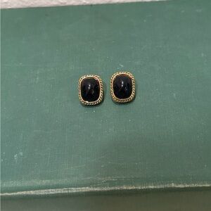 Pretty Vintage Earrings with Gold Rope Like Detailing Around Edge and Large Navy/Black Stone in Middle.