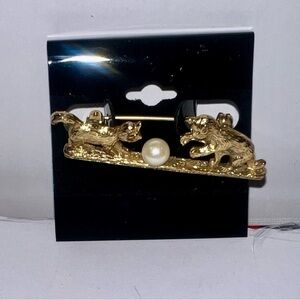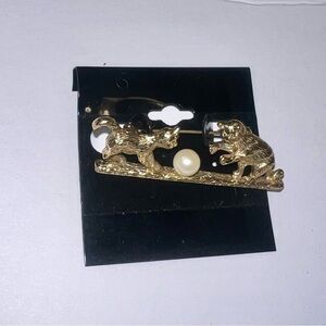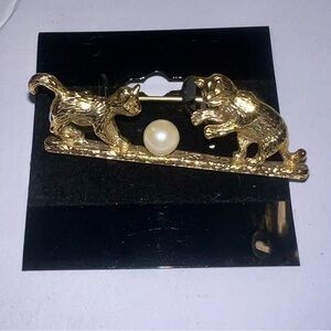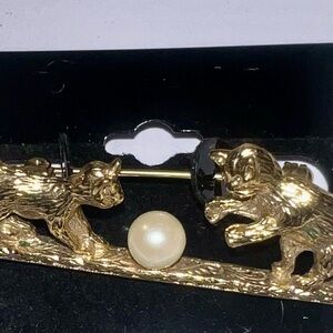 Vintage Gold Over Copper Cats Playing with Pearl Brooch. Used