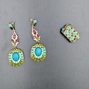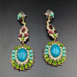 • Banana Republic chandelier statement earrings with turquoise, green, garnet, and clear crystal stones set in gold tone. Signed BB on reverse. Excellent preowned condition.