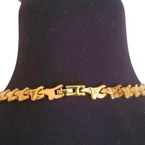 This striking vintage necklace is so unique and eye-catching! Featuring bold geometric angular links in rich gold-plated accents. It has a fold over clasp and is not hallmarked.