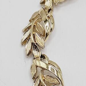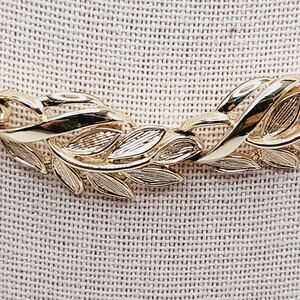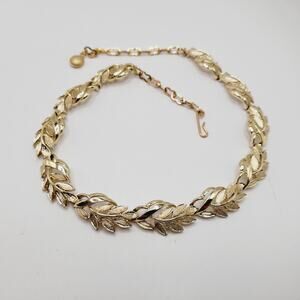 This is a beautiful vintage gold plated choker necklace featuring linked leaf motifs with textured and polished details. The classic mid-century design lays beautifully against the neckline and adds a touch of sophistication to any outfit.