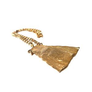 Thisj gorgeous vintage gold tone nugget pyramid necklace is the perfect next addition to your amazing jewelry collection! This retro and unique necklace is a gorgeous gold tone and has a large triangle pendant. It's also in perfect vintage condition! This necklace is perfect for both casual and formal outfits alike. Get this gorgeous gold necklace necklace for yourself or for someone in your life who loves vintage gold jewelry!