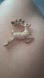 Charming gold reindeer brooch. Embellished with green and red accents. Perfect for festive occasions.