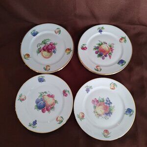 The Bavarian-made plates feature a colorful fruit pattern with gold rims, making them perfect for all occasions.