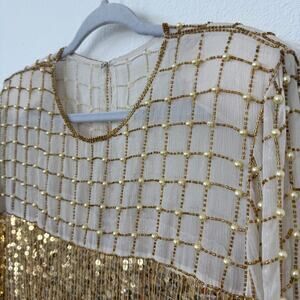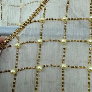 Gold seed beads, faux pearl accents, and sequin fringe hand-sewn onto sheer silk overlay