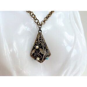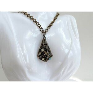 Beautiful Gold & silver toned vintage pendant chain necklce. The pendant has tiny leaf designs with turquoise and faux pearl attached elements. The closure is clasp style and works perfectly. Pednant is diamond shaped. 4 sided.