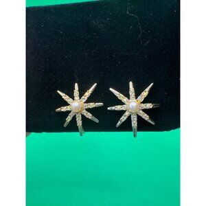 Vintage Gold Starburst Earrings W/ Pearl & Rhinestones Clip-On Costume Jewelry
