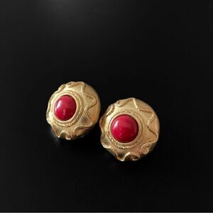 Vintage gold tone post stud earrings with red cabochons. Unsigned. Nice quality, heavier weight. Approx. 3/4” diameter