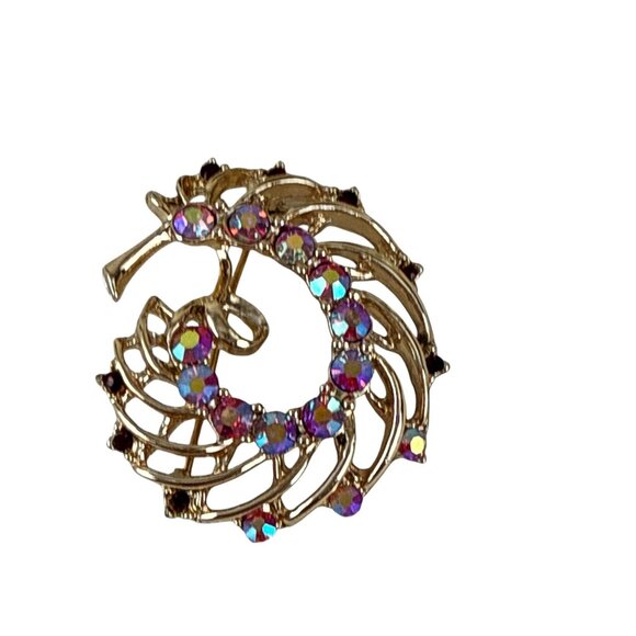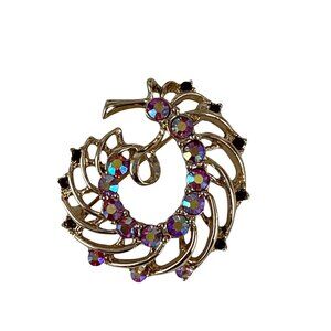 Beautiful vintage gold-tone swirl brooch featuring vibrant aurora borealis rhinestones set in a circular design. This elegant mid-century piece catches the light beautifully and adds a sparkling accent to any outfit. A timeless accessory for collectors or vintage fashion lovers.
