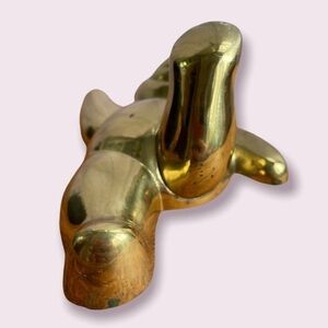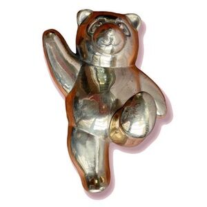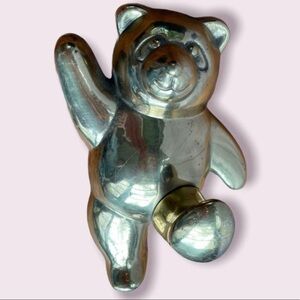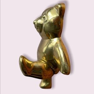 Nab this sweet vintage teddy bear piece for a nursery or kids' room! This brass teddy bear is a chunky little dude in the best way, with one of his feet acting as the hook. It's got a built-in space on his back for easy hanging. This bear is approx 6.75" tall. A shiny gold bear, he’s timeless and adaptable to almost any decor.
