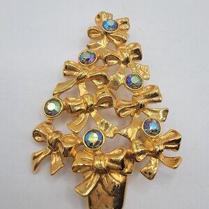 Vintage Gold Tone AB Rhinestone Bow Christmas Tree Signed Avon Brooch Pin
