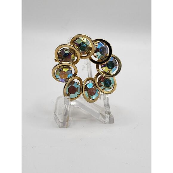 Vintage gold tone wreath style brooch featuring aurora borealis rhinestones in prong settings. The circular design is composed of faceted crystals framed in gold tone settings, creating vibrant multicolor sparkle with depth and dimension.