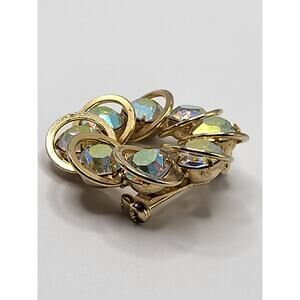 Vintage Gold Tone AB Rhinestone Wreath Brooch Prong Set Crystal Pin